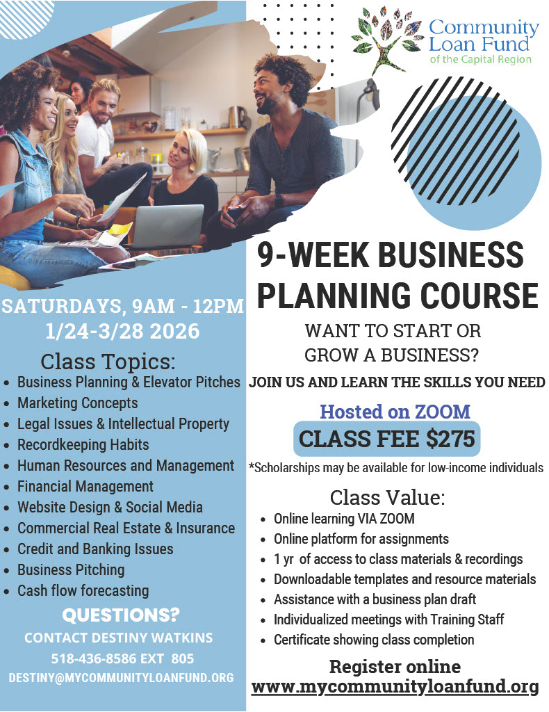 Join us for some real world business planning. Learn what you need to know to start and run a successful small business with our 9-week intensive training course, now offered virtually. Class topics include: Developing a Business Plan, Bookkeeping, Marketing Concepts, Sales Forecasting, Financial Management and analysis, Website Design & Social Media, Commercial Real Estate & Insurance, Credit, Banking and Legal Issues. The course provides fundamental planning concepts and tools to help existing and potential business owners.