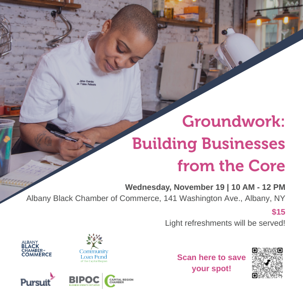 Groundwork is a collaborative initiative uniting the Albany Black Chamber of Commerce, the BIPOC Business Growth Initiative at the Capital Region Chamber, the Community Loan Fund, and Pursuit. Together, these partners are committed to empowering BIPOC entrepreneurs by providing access to capital, tailored business support, and a network of resources designed to help enterprises grow from the inside out—building stronger businesses, stronger communities, and a more inclusive economy.